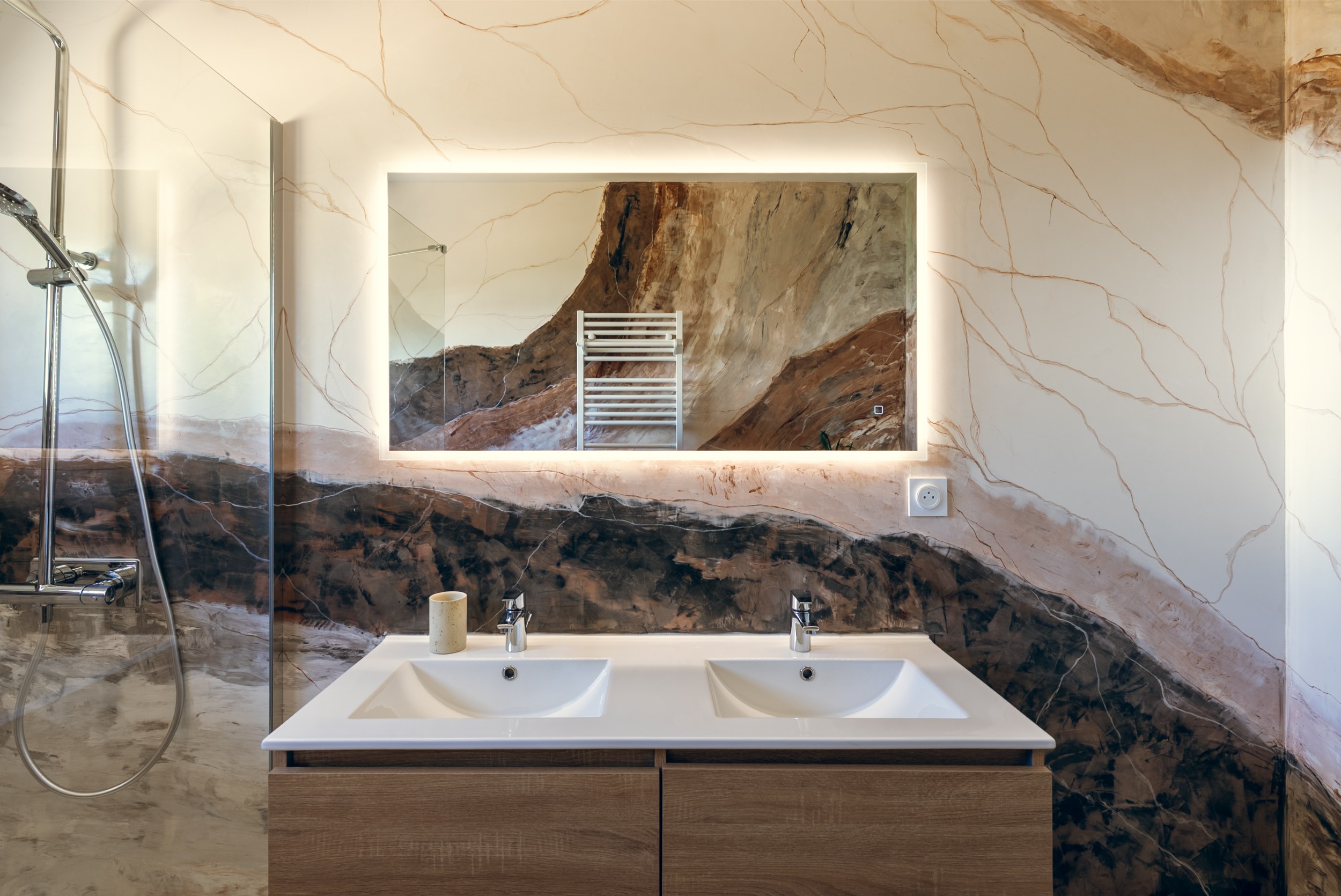 Le logement comprend deux chambres équipées de lits queen-size 160×200, ainsi qu’un salon convivial avec un canapé convertible et un espace détente avec TV. La cuisine ouverte est entièrement équipée : réfrigérateur, four, micro-ondes, plaques, lave-vaisselle, cafetière, vaisselle et ustensiles. La salle de bain dispose d’une douche à l’italienne et d’un meuble vasque, et les WC sont séparés pour plus de confort.